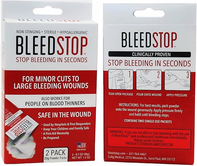 BleedStop First Aid Powder for Blood Clotting, Trauma Kit, Blood Thinner Patients, Camping Safety, and Survival Equipment for Moderate to Severe Bleeding Wounds or Nosebleeds (Bleedstop - 4 Pack 15g) $15.00